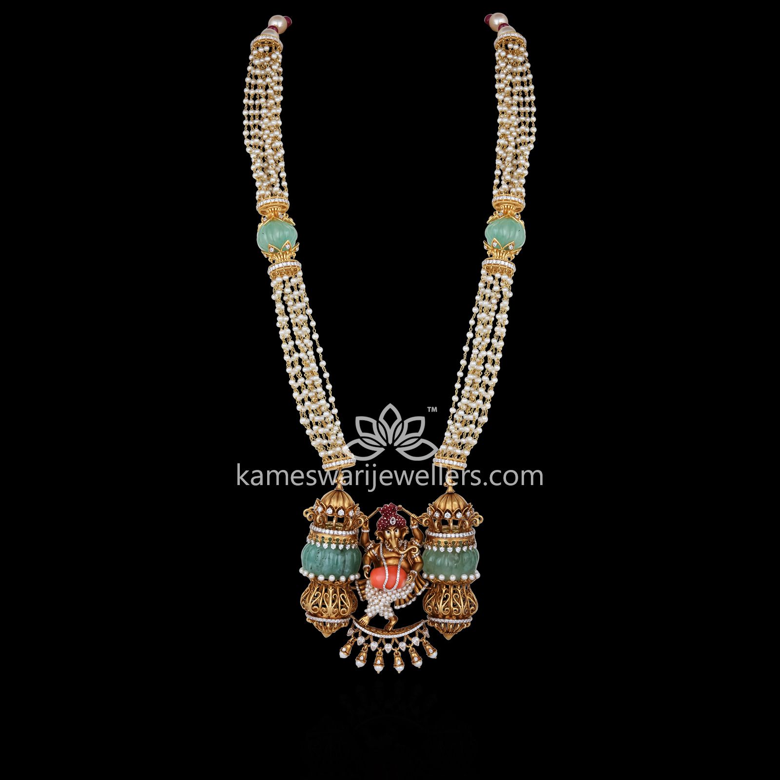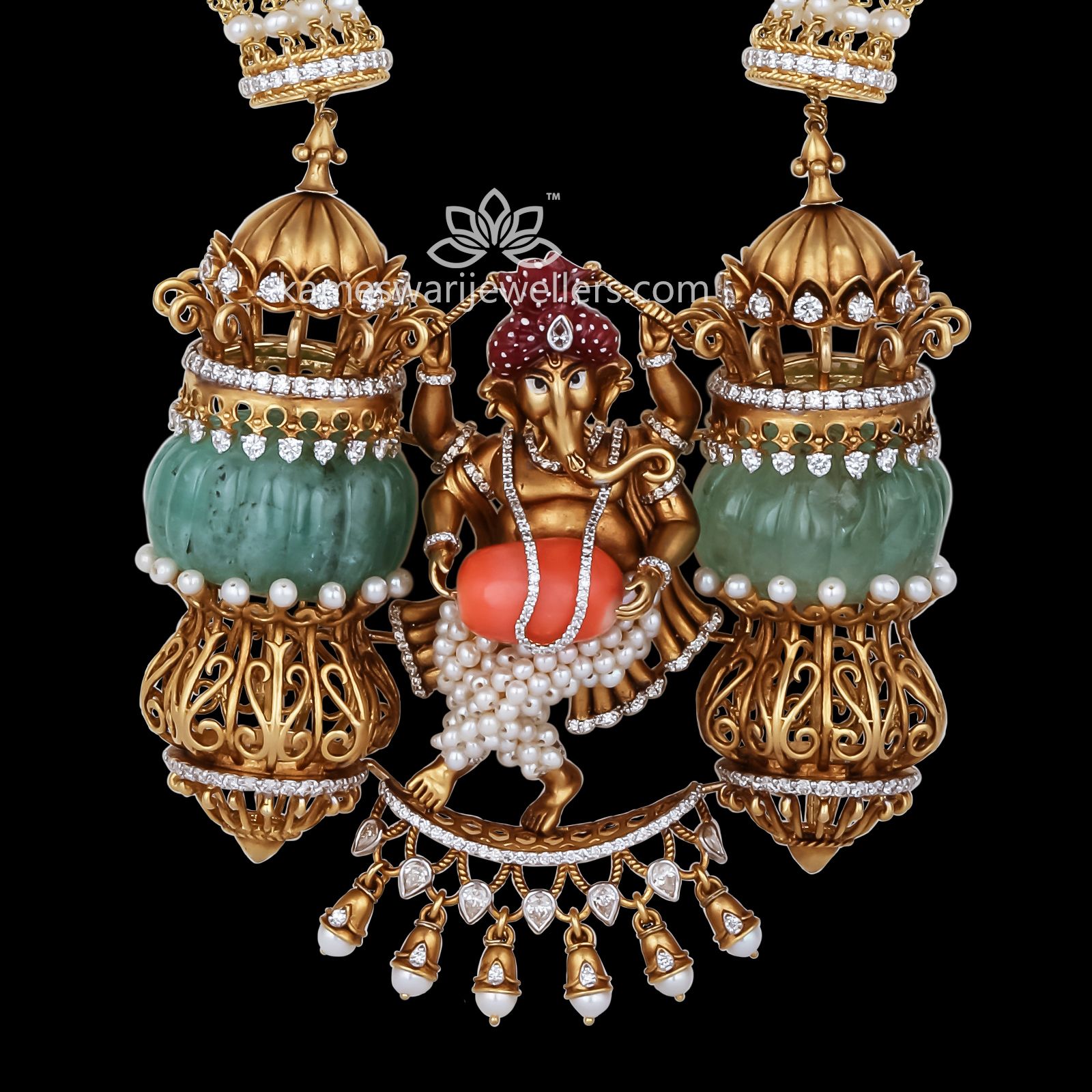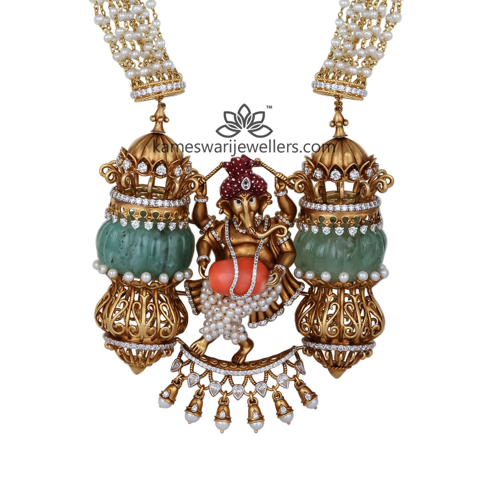 Motif of Lord Ganesh – marks the beginning of every happy event. This piece is carved with Emeralds, Ruby, CZ, and Pearls. Enjoy the positive vibes and look appealing at the same time wearing this necklace.