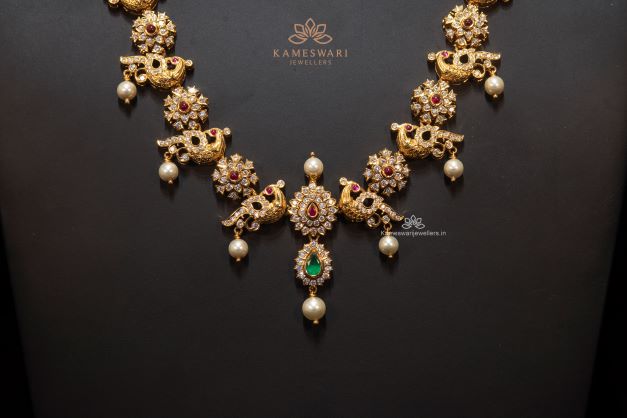 Shine brighter with this manginificent stunner. Crafted with utter precision, this necklace sparkles with round cut diamonds sprinkled with color stones arranged in an alluring design of gold.