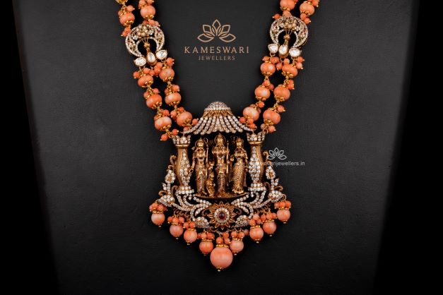 Feel the divinity of this exquisite necklace that showcases row of coral beads.This necklace defines utmost beauty in a way that promises both style and elegance. This Victorian work necklace has a Ram Parivar motif pendant which makes this necklace even more noticeable.