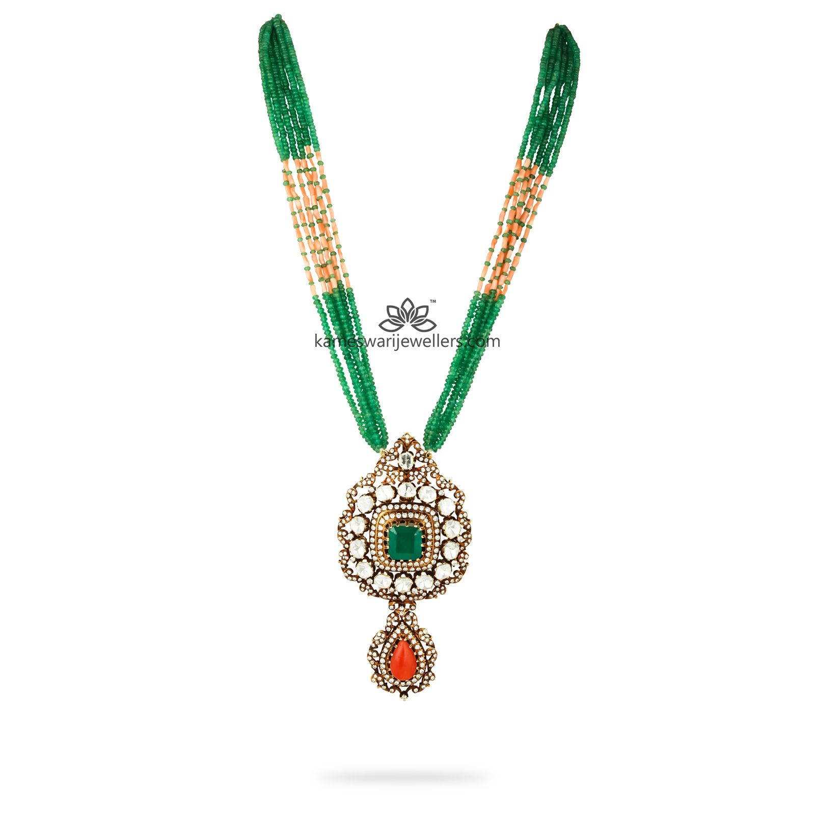This neckpiece is a combination of classic and contemporary design, with emerald as the highlight in the beads as well as the centrepiece. Featuring multiple strands of emerald beads,the pendant of the necklace is exotically studded with polki stones, pearls and diamonds.