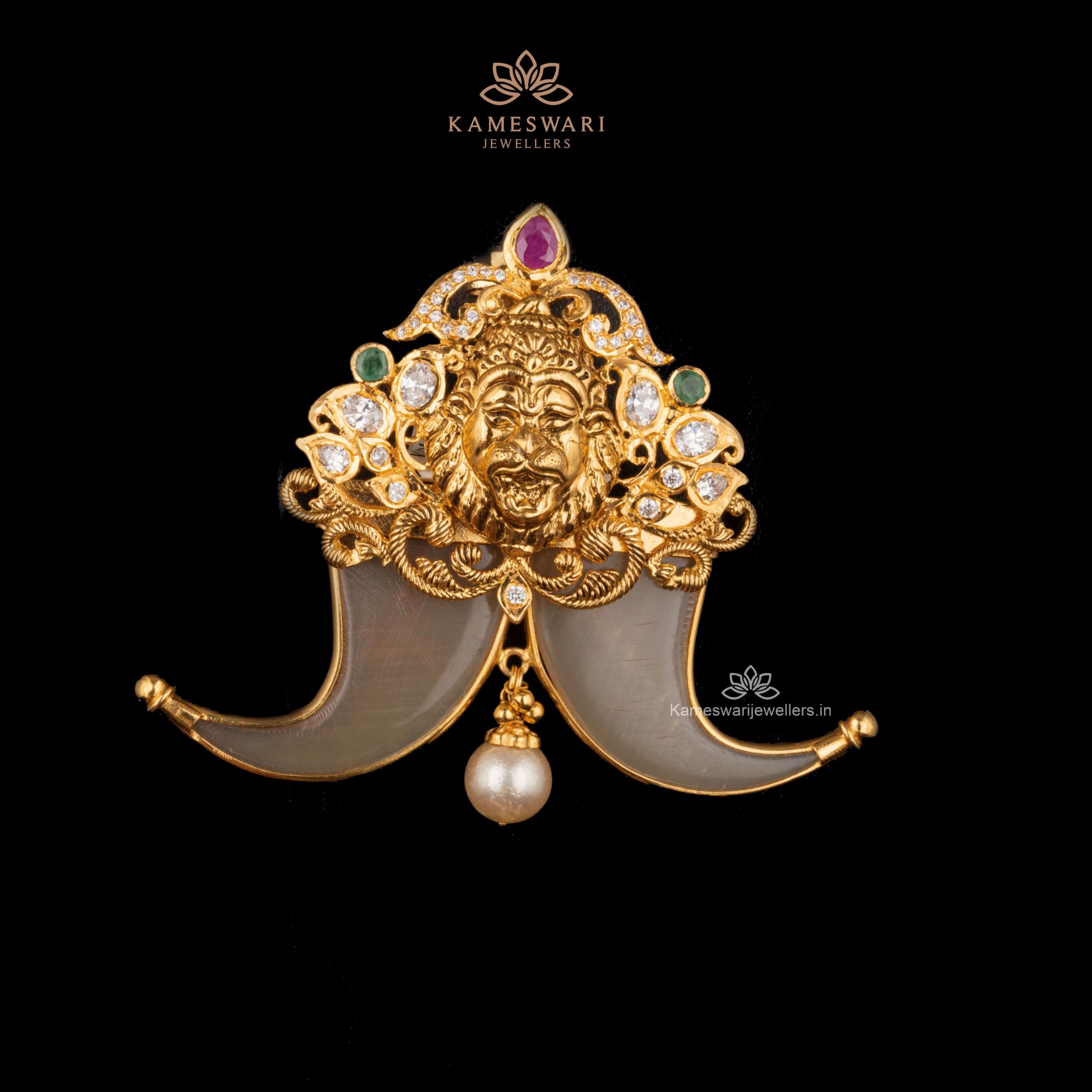 The Puligoru locket is a traditional and culturally significant piece of jewelry that holds deep-rooted symbolism which is studded with rubies, emeralds and cz stones, it is worn as a cherished ornament in many South Indian communities.