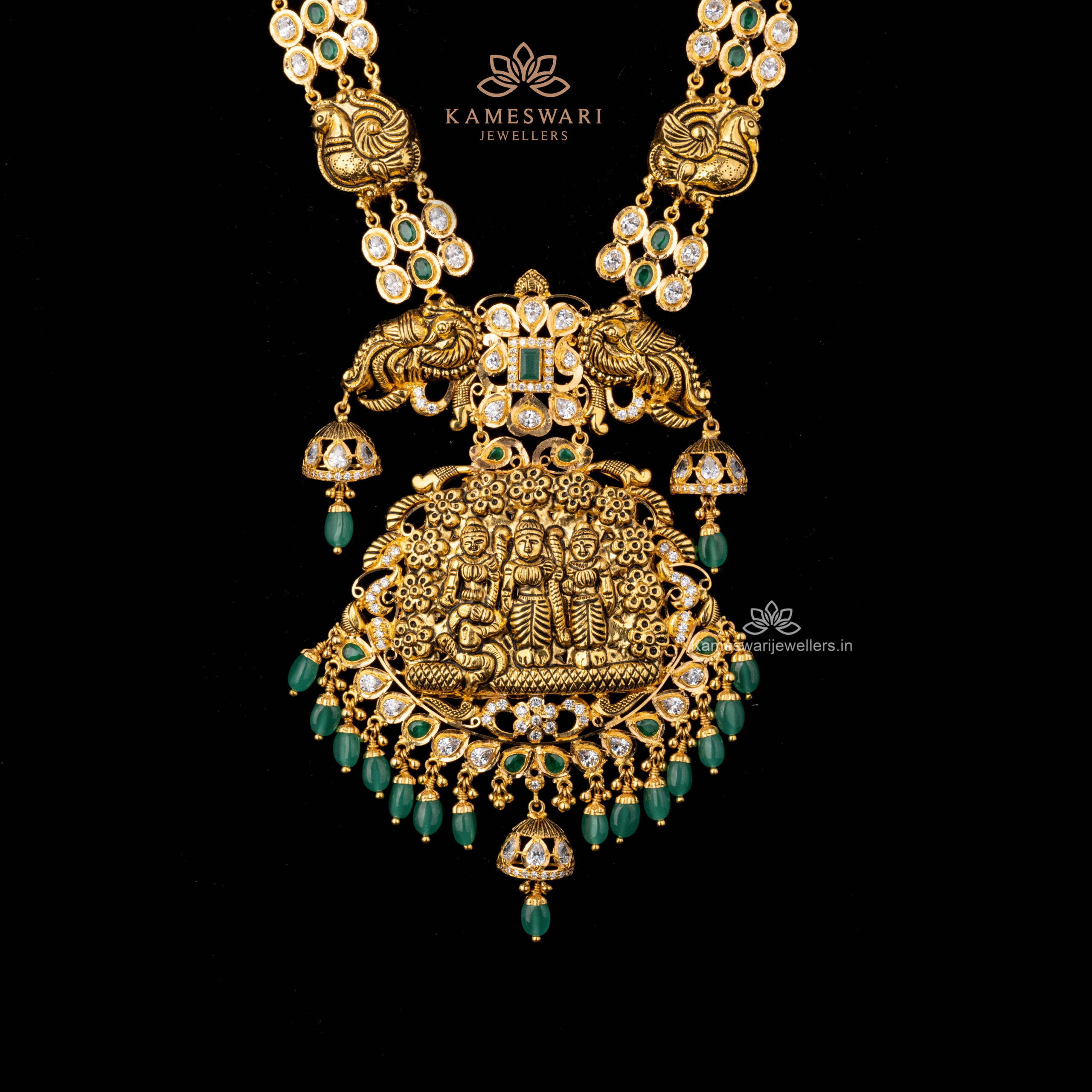 Majestic Pachi Haram with Goddess Motif and Emerald Accents | Kameswari Jewellers