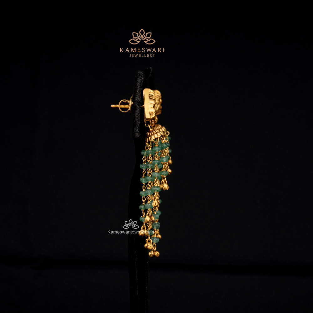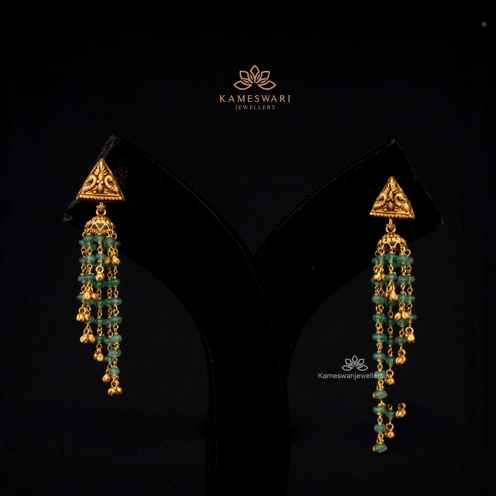 Introducing an example of delicacy and elegant style! This Jaali style Necklace Set is embellished with Emeralds and Coral and the entire necklace has good coin motifs with Lord Ganesh engraved in it, swings at the center.