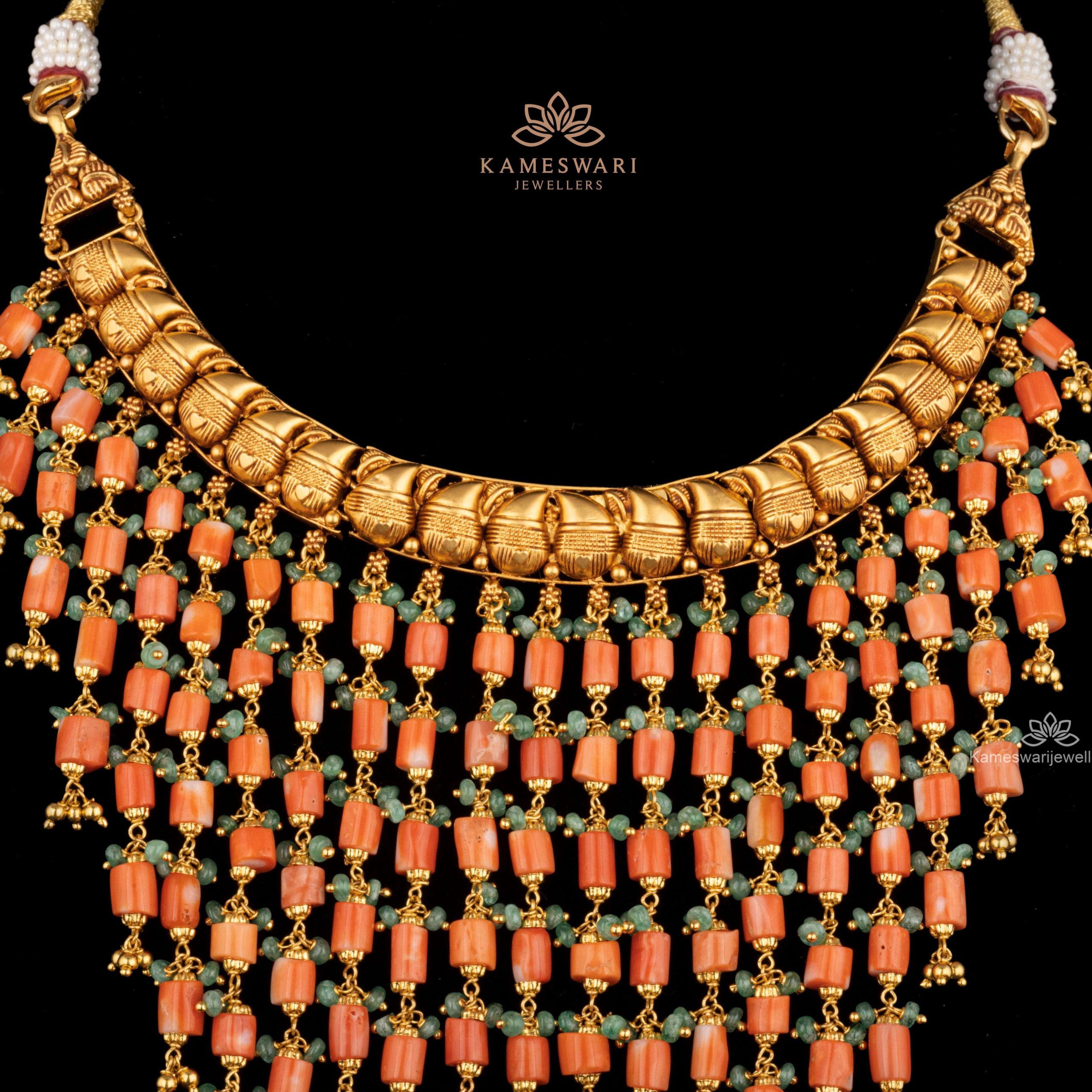 Here is a stunning piece of jewellery that can instantly captivate your audience with the play of colours that it features. Showcasing multiple strands of coral in bright orange and glowing emeralds, this beads kanti is a collector’s delight.