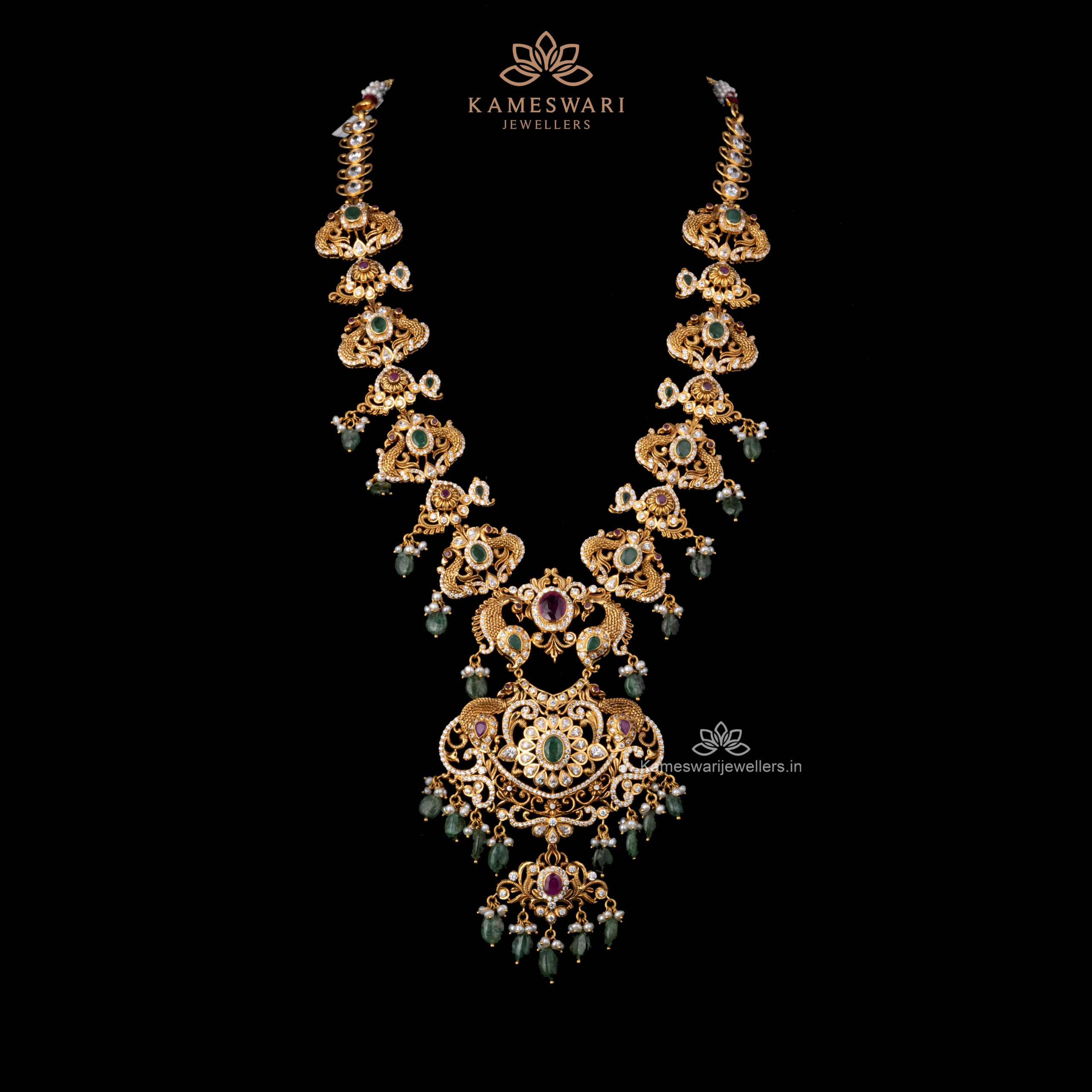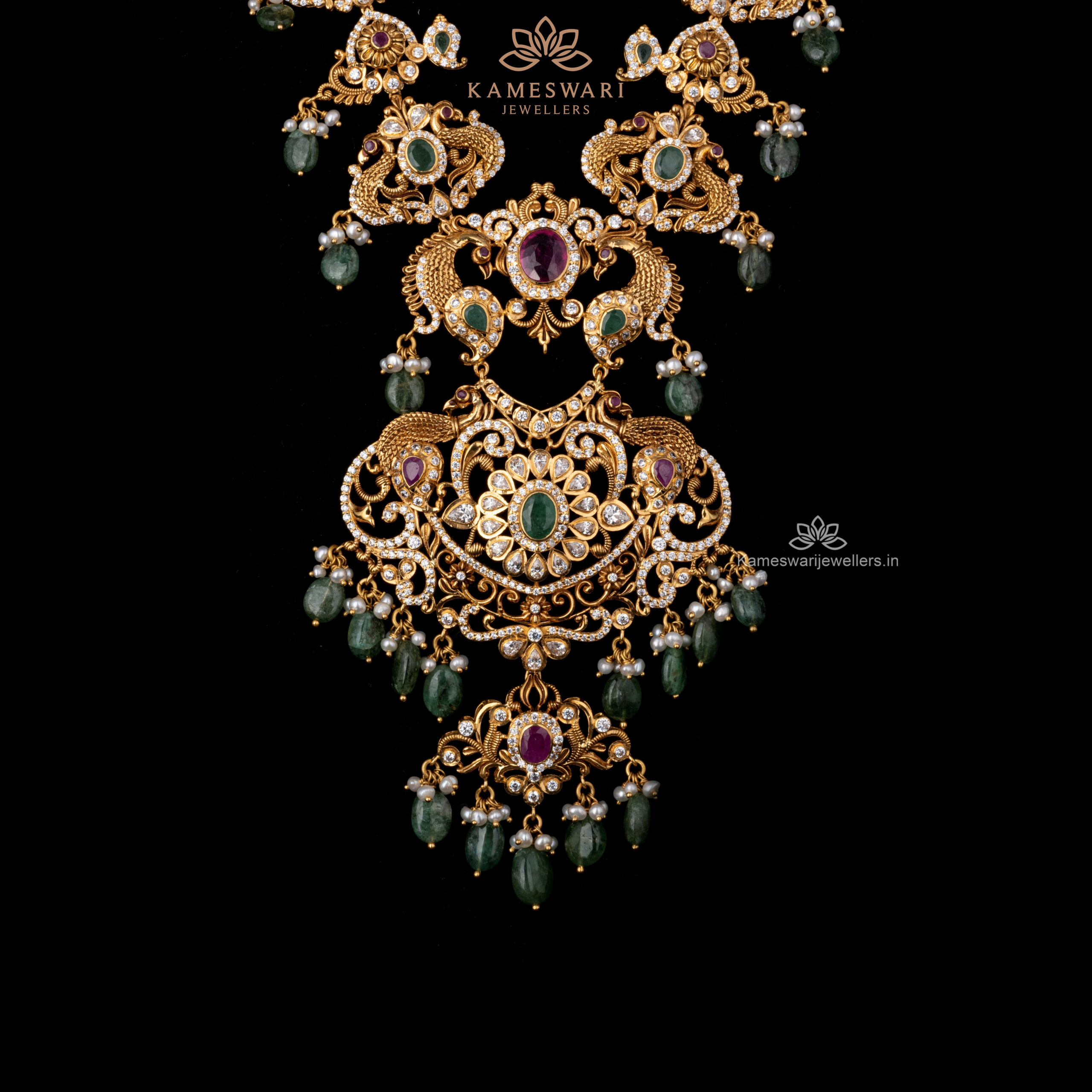 Pachi Haram with Gemstones and Elegant Peacock Motifs | Kameswari Jewellers