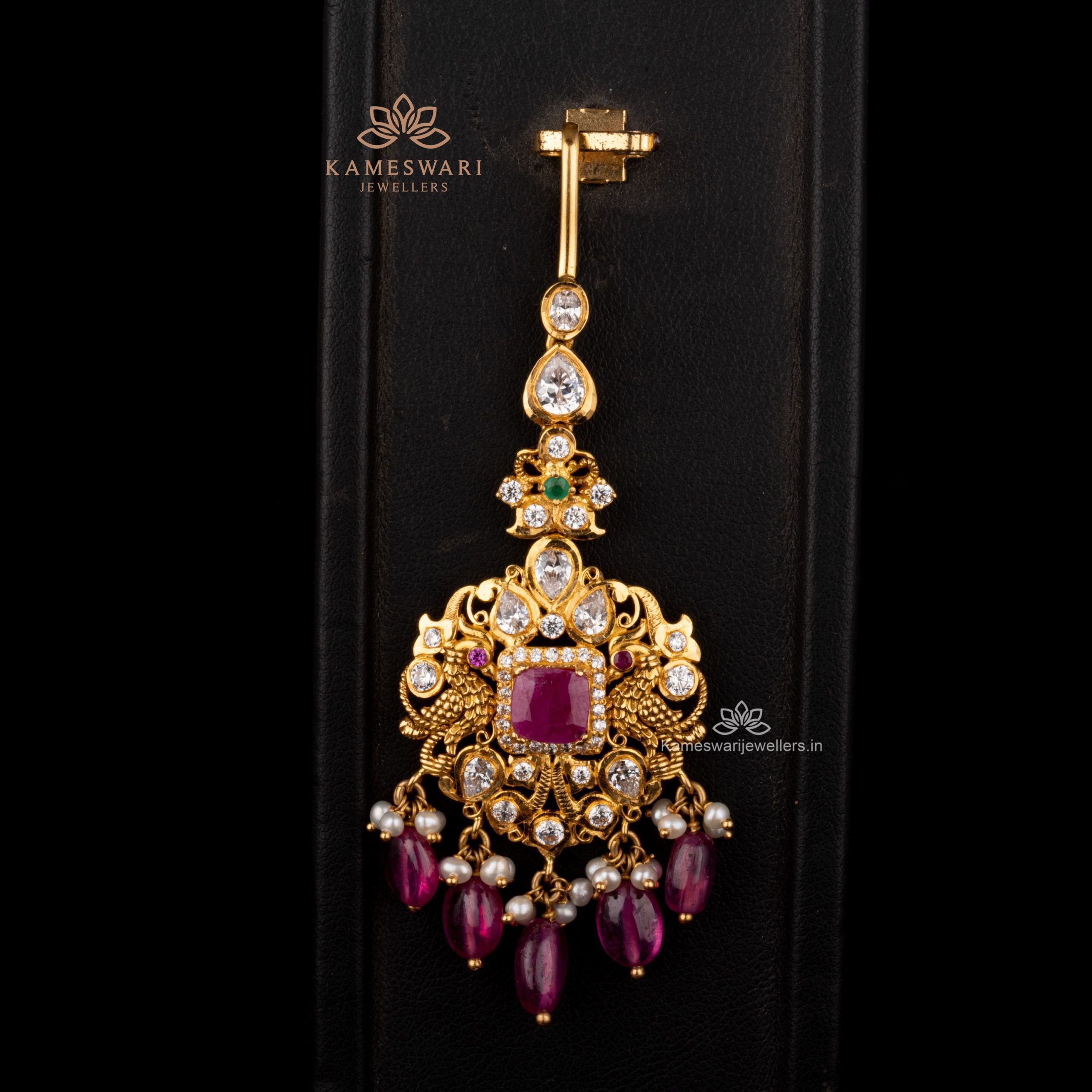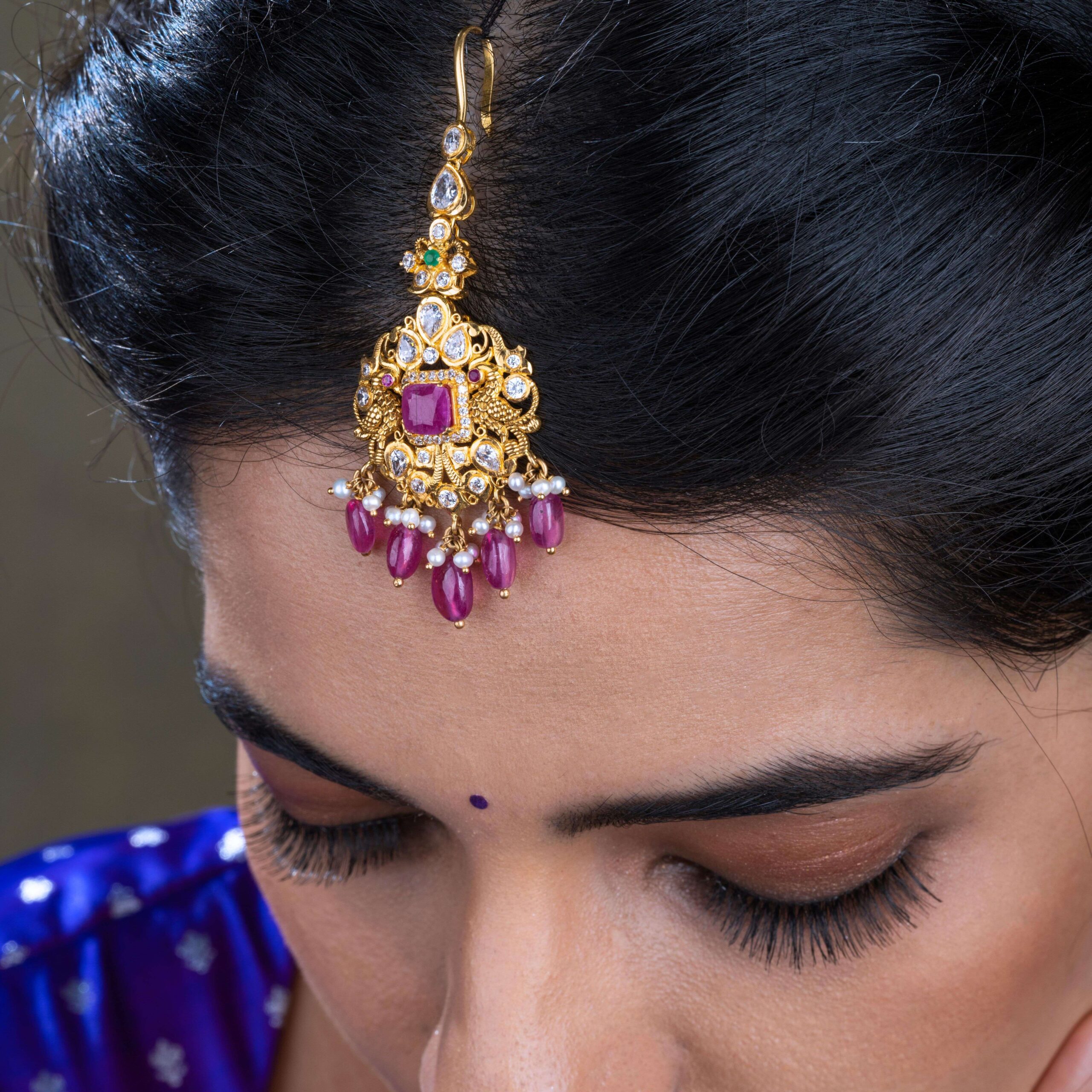 The charm and aesthetic of this Pachi Work assembled with Ruby, Emeralds, CZ, and Pearl is just perfect to decorate your forehead. The royal look of the piece will help you make a style statement. Add to your collection now!