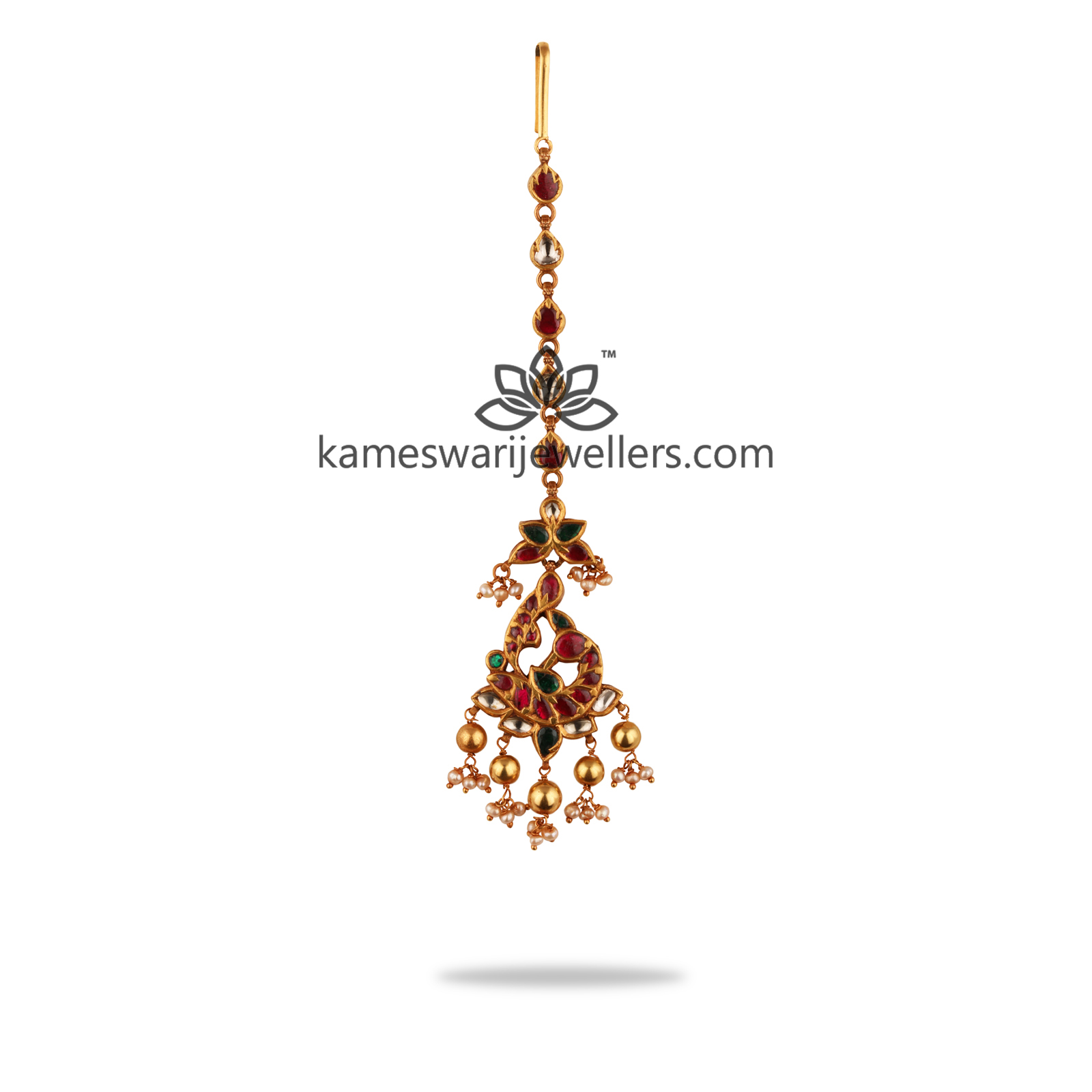 For times when you want to keep it simple and cannot decide what you need to look finished to perfection, this maang tikka is what you can count on, studded with Rubies, Emeralds, Pearls and CZ Stones, you can pair it with your traditional outfit.