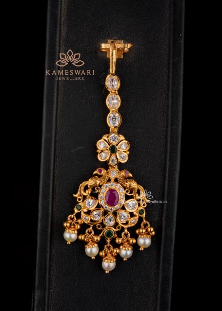 This Glowing Pachi Maang Tikka made with gold, dazzling CZ stones, Rubies, Emeralds and Pearls, this Pachiwork Maangtika instantly elevates your style to occasion-worthy status by drawing attention to and brightening your face.