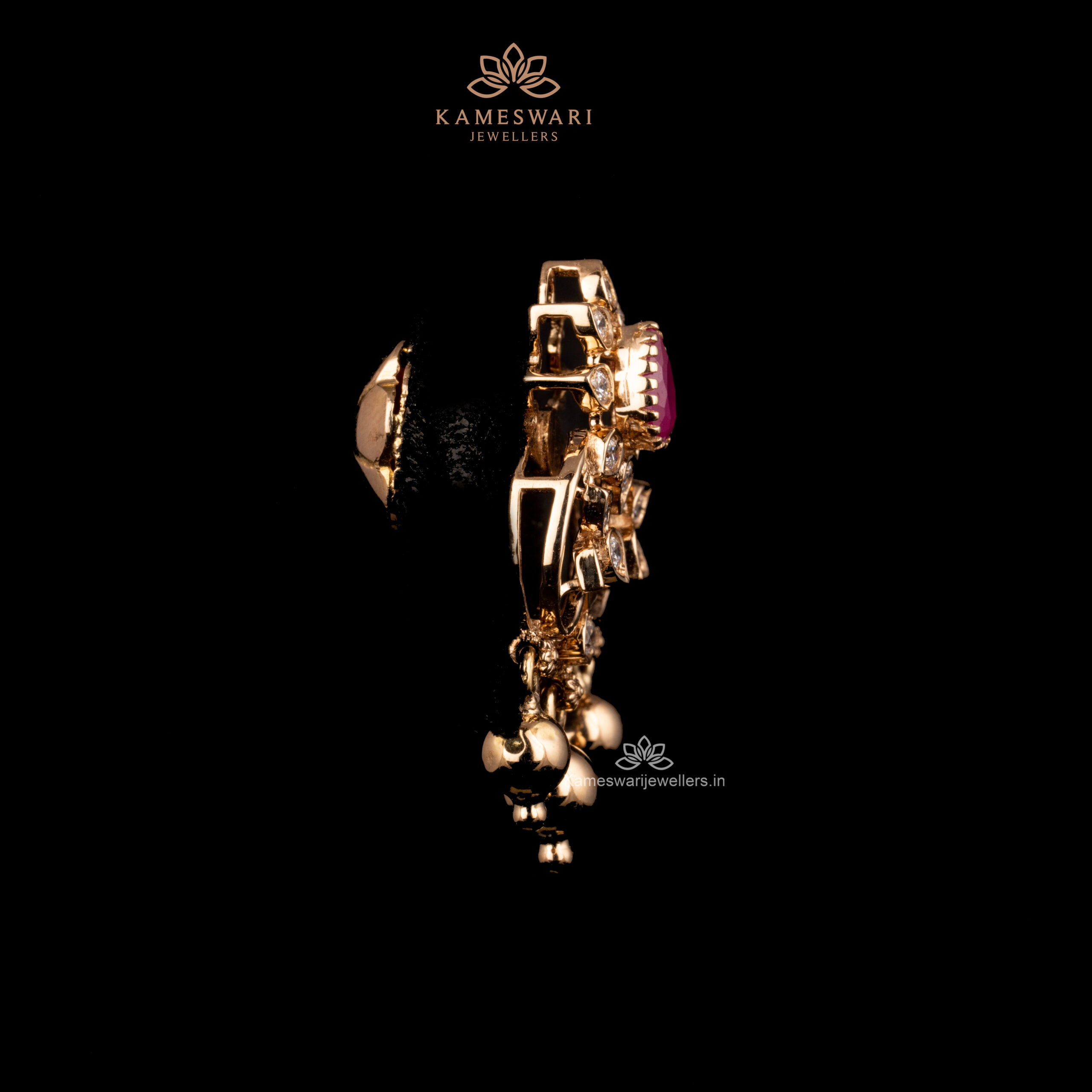 Be the first to review “Ruby teardrop CZ earrings with circular motif and gold bell drops.” Cancel reply